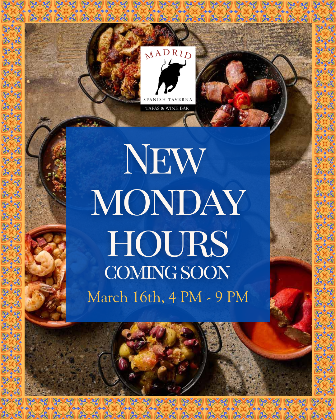 Madrid Spanish Taverna warmly welcomes the opportunity to cater your upcoming event. We are committed to customizing each gathering to perfectly align with your preferences and requirements, ensuring the utmost satisfaction for you and your guests.